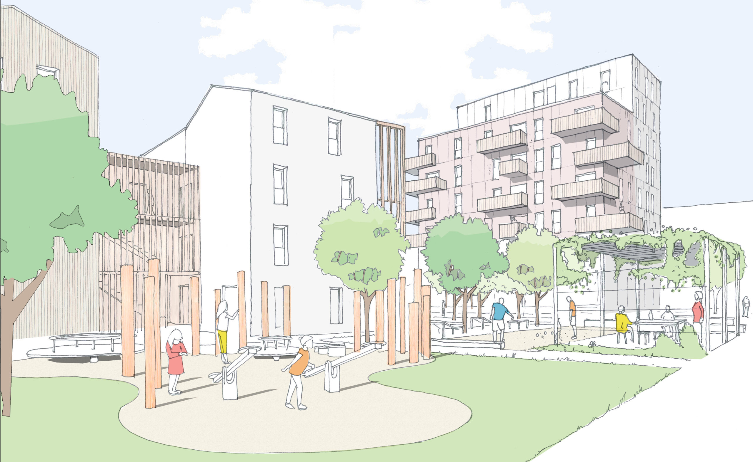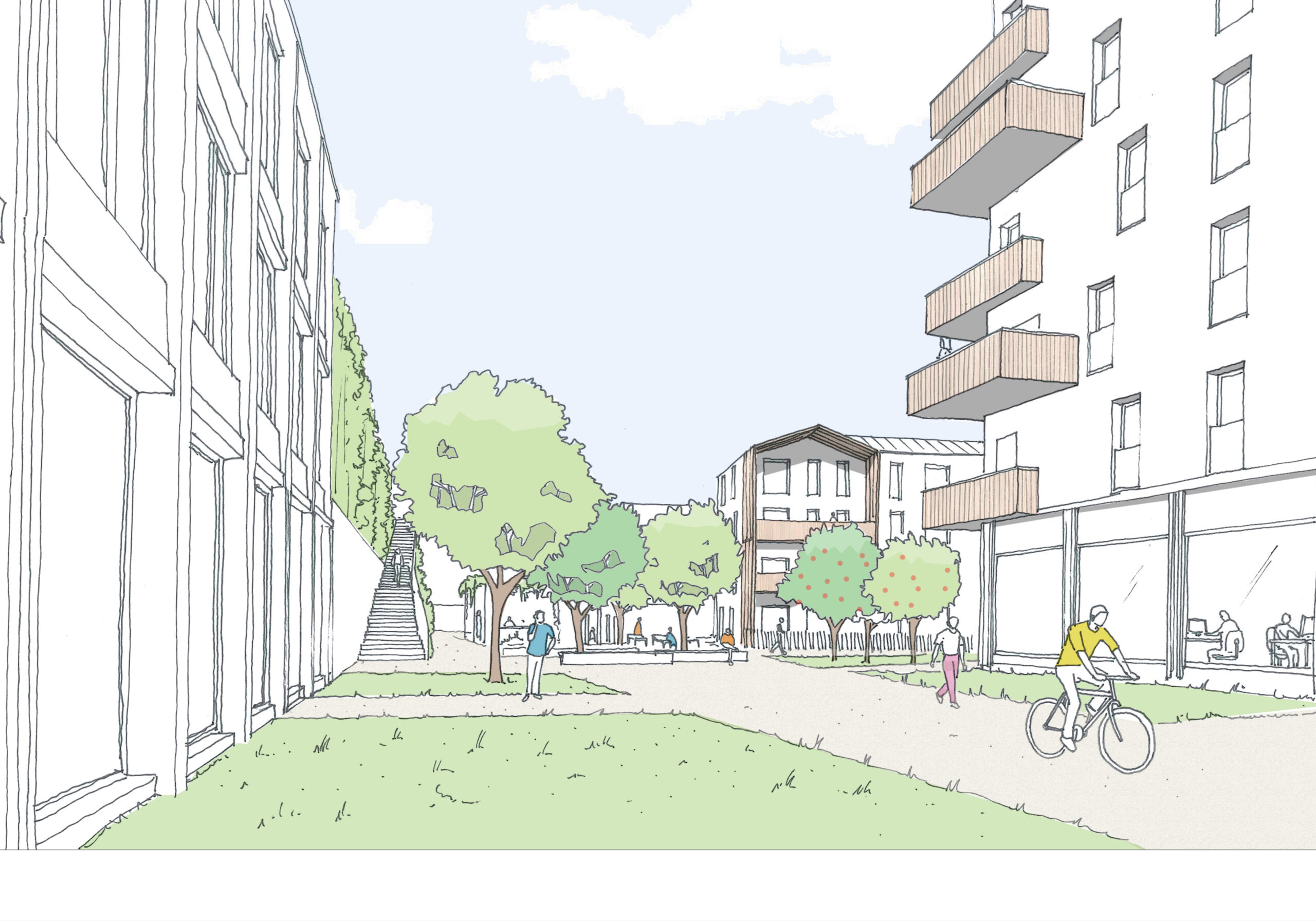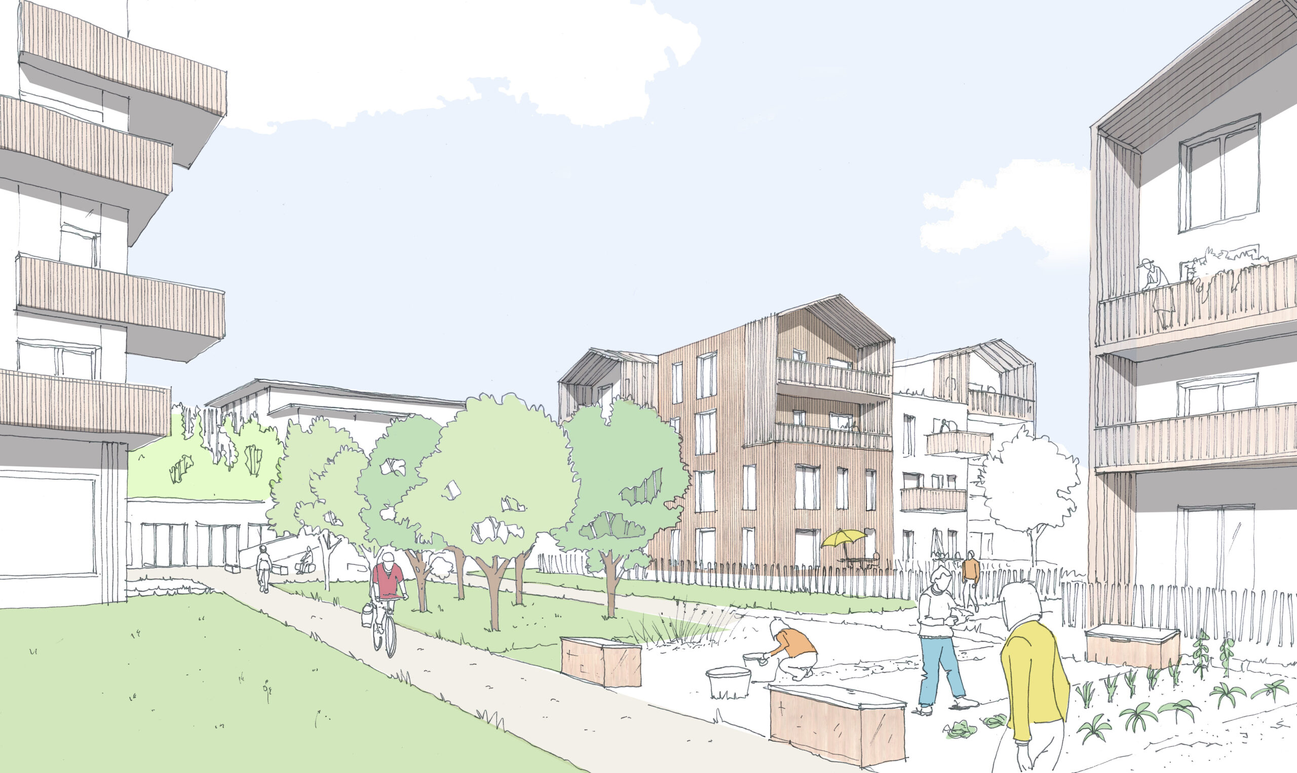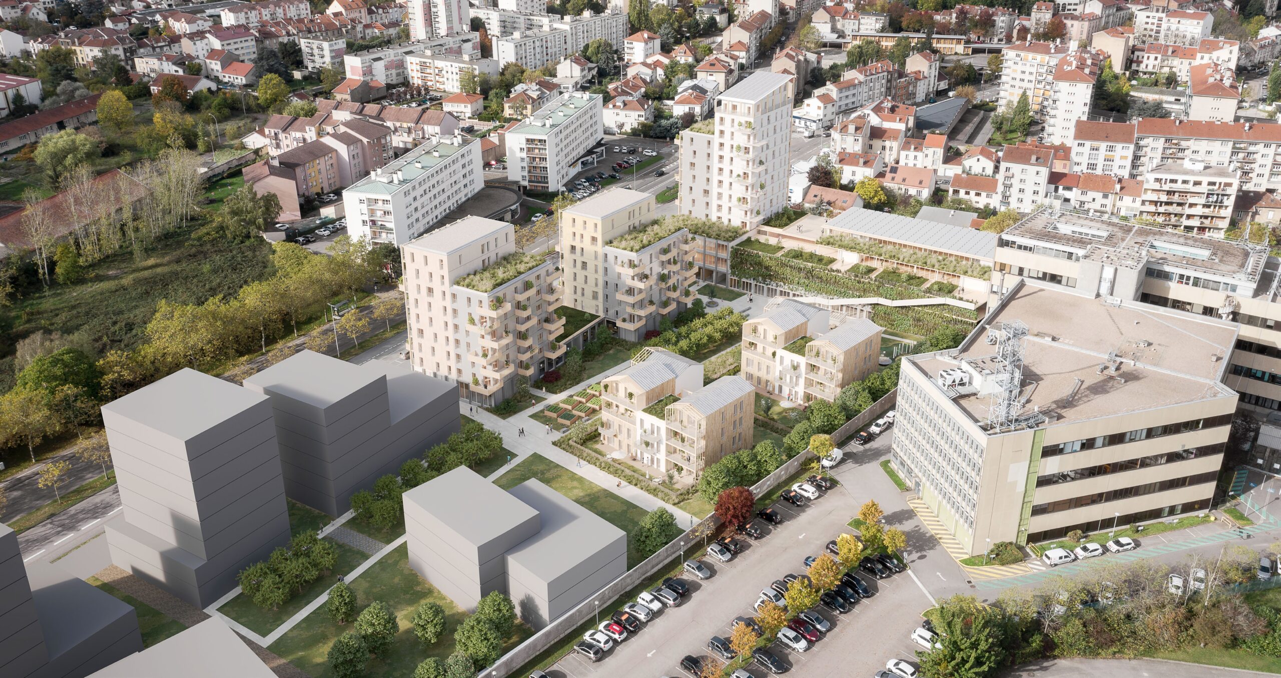 Ce projet de grande ampleur associant logements (accession à la propriété et logements sociaux), commerces, bureaux et parking a pour ambition de proposer une qualité urbaine et d’habitat élevée, donnant du sens à la dimension constructive de l’opération.